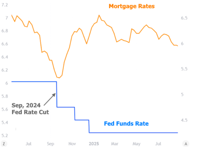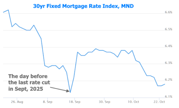 In fact, most of the recent examples involve mortgage rates RISING after the Fed CUTS. September 2025’s example couldn’t be clearer: