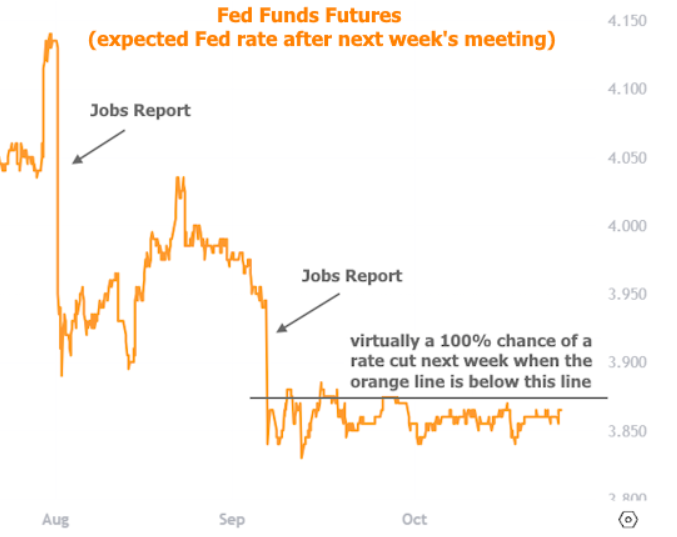 The following chart shows those rate expectations. In not so many words, the market has been roughly 100% sure of a Fed cut next week ever since the jobs report that came out in September.