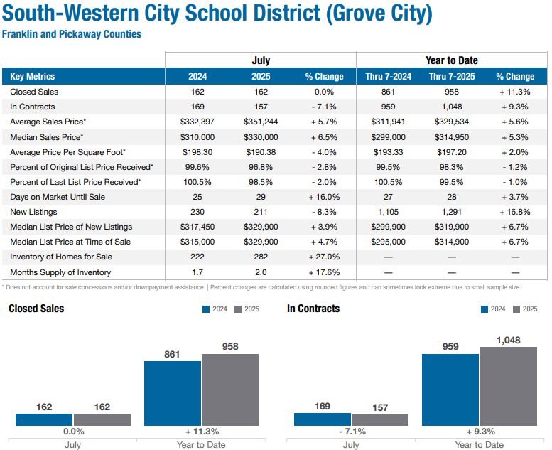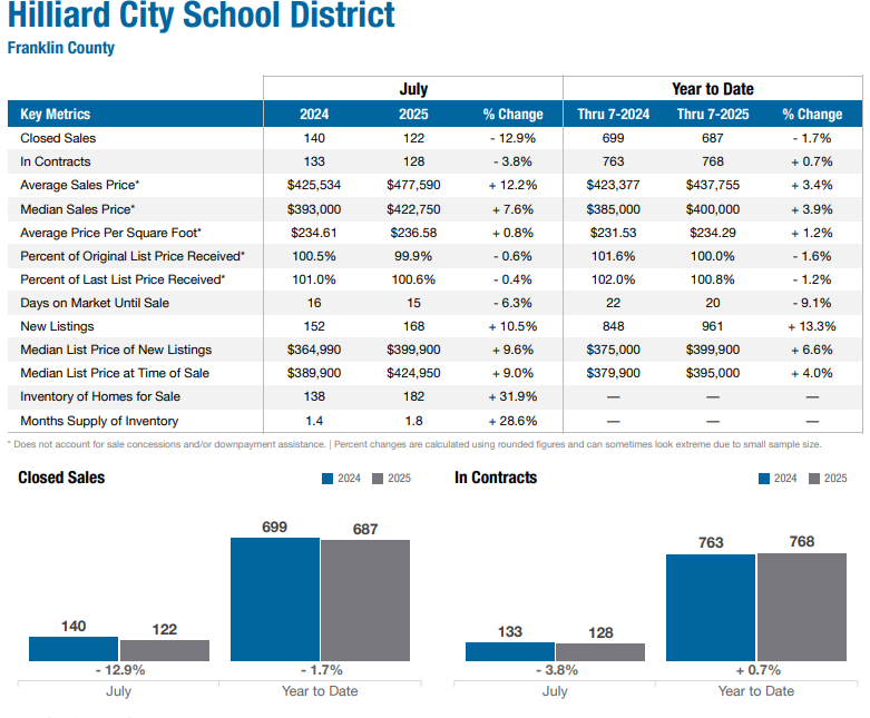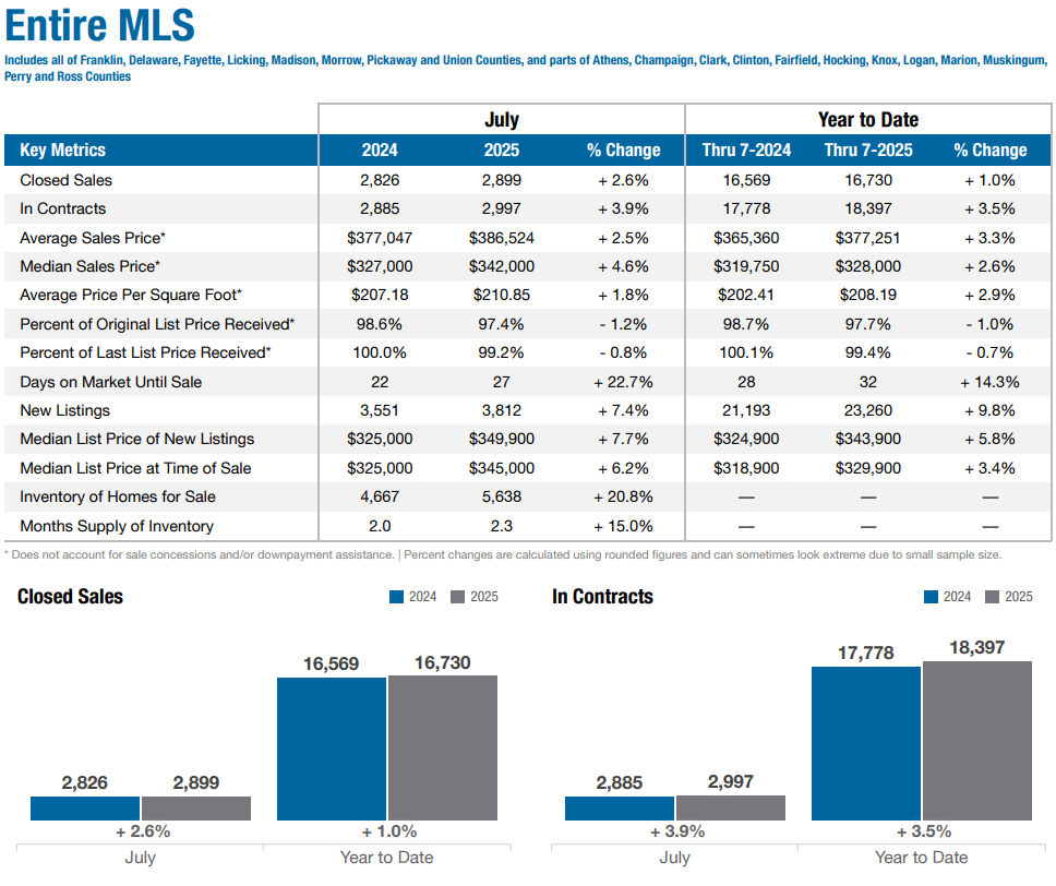 There were 2,899 closed sales in July, and the median sales price rose 4.6% to $342,000. While closed sales were up 2.6% year over year, July’s numbers marked a 1.8% decrease over June, when 2,951 sales were reported. Housing inventory in central Ohio is up 20.8% year over year and 8.7% over last month as 5,638 single-family homes and condominiums were listed in the MLS in July. This marks the highest inventory of homes for sale since 2016, when there were 6,273 homes on the market. “The increased inventory gives buyers more choice, and in some cases, more time to make their decision,” said 2025 Columbus REALTORS® President Buffie Patterson. “For sellers, accurate pricing matters now more than ever. A REALTOR® will help the seller stand out and protect your bottom line.” With the rise in inventory, the days on market have increased to 27 days. Last year at this time, homes were selling in 22 days. There are currently 2.3 months of supply in central Ohio. This statistic estimates how long it would take to sell all active listings at the current monthly sales pace. Most economists consider a balanced market to be 5 to 6 months of inventory, meaning sellers still hold the advantage in central Ohio. The median sales price is $18,000 higher than July 2024 at $324,000. While suburbs such as Dublin, Powell, New Albany, Grandview, and Bexley all boast median sales prices over $600,000 there are some more affordable communities who are seeing increased sales. Additionally, Bexley was named the No. 10 Hottest ZIP Code in the United States for 2025 by Realtor.com on August 6.